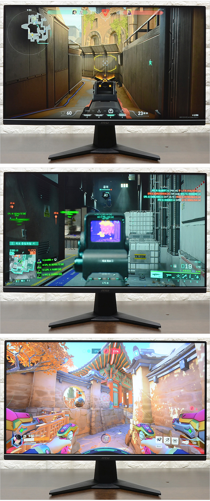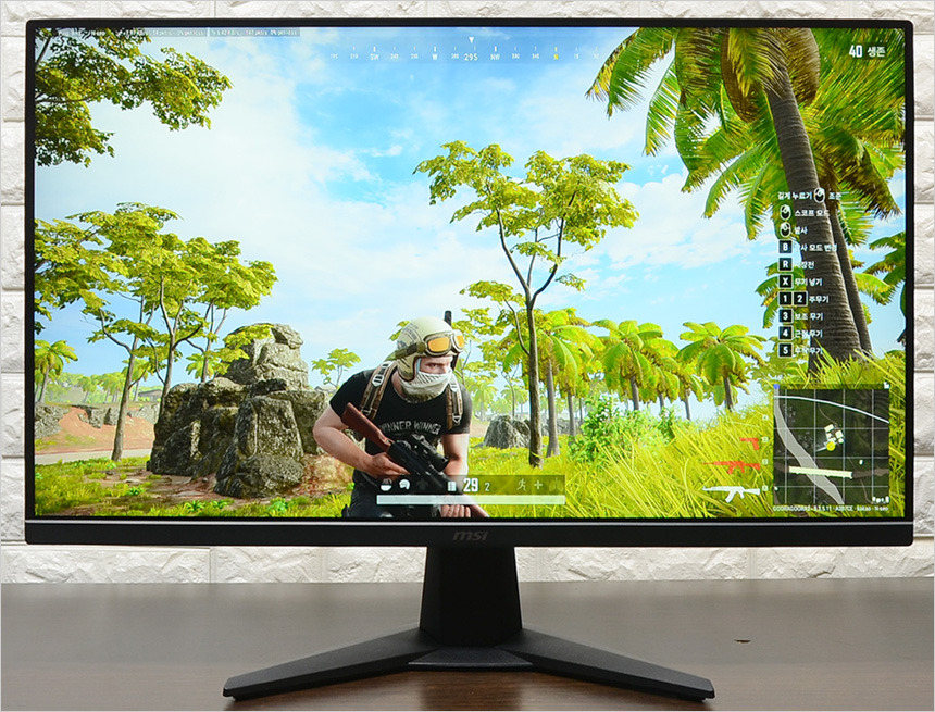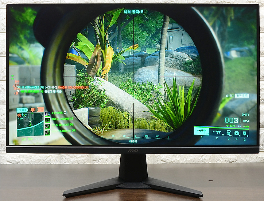 IPS 특유의 진한 색감이 인상적이었으며 어댑티브 싱크 기술을 지원해 게임실행 내내 화면 찢어짐 등으로 인한 오작동 없이 깔끔한 영상을 보여주다. 뿐만 아니라 다양한 조준선을 지원해 사격 정확성을 높일 수 있었으며 250nits 의 밝기를 지원해 다소 어둡지 않을까 걱정했는데 밝기를 높이면 게임을 즐기는데 전혀 불편이 없었다.
