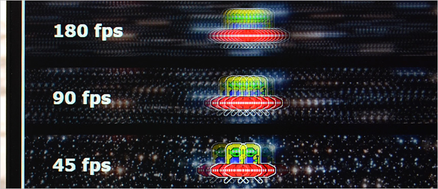 고급형 게이밍 모니터 답게 144Hz 주사율을 지원하는 보급형 모델들과 달리 180Hz 의 높은 주사율을 응답속도도 0.5ms 로 대단히 빠르다. 빠른 움직임이 필수적인 FPS 게임에서 정확하게 움직임을 확인하고 한발 빠르게 대처할 수 있는 모델이다. 상단의 사진은 180Hz 주사율을 쉽게 인지할 수 있도록 하위 프레임과 같이 재생되는 영상 (960 Pixel Per Sec) 을 셔터스피드 1/20 로 촬영한 모습으로 프레임이 높아질수록 시간당 많은 화면이 뿌려져 캐릭터의 수가 많은 것을 확인할 수 있다. 눈으로 영상을 볼 경우 180Hz 에서 더 자연스럽게 UFO 가 이동한다.