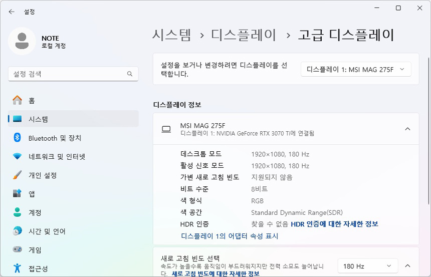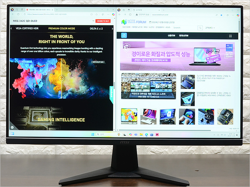 27형 대화면에 FHD 해상도를 지원해 2개의 창은 여유롭게 띄어두고 사용할 수 있다. 멀티테스킹 등의 작업용으로도 편하게 활용할 수 있을 것이다. 참고로 이 제품은 180Hz 주사율을 100% 활용하기 위해 고성능 모델이 사용을 권장한다. (RTX 4060 이상급의 그래픽카드 사용해야 180프레임을 원활하게 확보할 수 있다.)