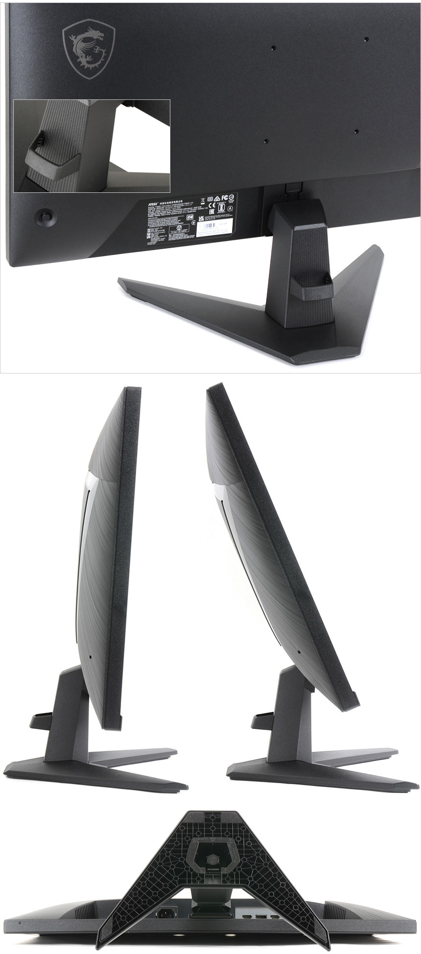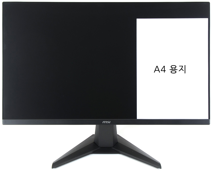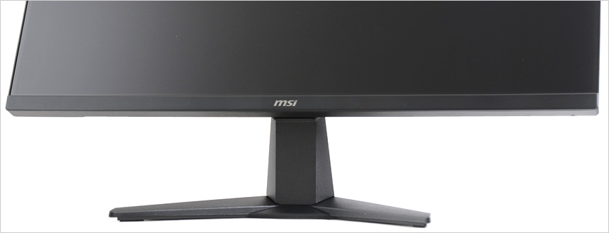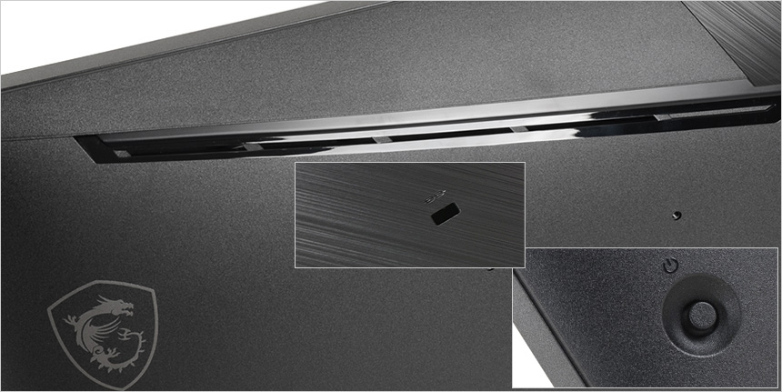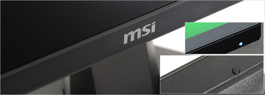 모니터 하단부의 모습으로 중앙에 MSI 레터링이 세겨져 있으며 측면에는 모니터 상태를 손쉽게 확인할 수 있도록 LED가 장착되어 있다. 참고로 이 제품은 유저들의 눈건강을 위해 블루라이트 감소나 플리커 프리등의 아이케어 기술을 지원하는 모델로 장시간 편하게 게임을 즐기거나 작업을 할 수 있다.