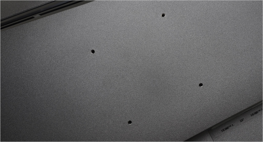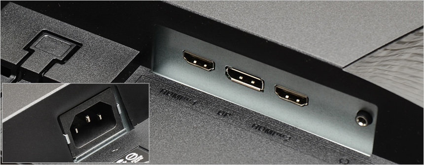 후면 중앙에는 100 x 100mm 베사홀이 설치되어 벽에 걸어 사용하거나 ARM 등에 장착해 활용할 수 있으며 (스탠드는 툴리스 방식으로 손쉽게 탈부착 할 수 있다.) 하단 중앙에는 DP 1.4a 단자와 두 개의 HDMI 2.b0 단자를 지원해 다양한 디바이스 연결이 가능하며 헤드폰 연결을 위한 오디오 Out 단자도 제공되는 것을 확인할 수 있다.