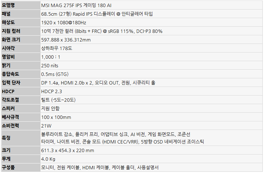 이번에 리뷰를 진행 할 MSI MAG 275F IPS 게이밍 180 AI 는 게이머를 위한 27형 고화질 모니터로 180Hz 의 높은 주사율과 0.5ms 에 불과한 빠른 응답속도 지원으로 FPS나 레이싱과 같이 빠른 화면전환이 빈번한 게임에서 분명하게 캐릭터나 적, 배경등을 구분하고 한발 빠르게 반응할 수 있으며 화면의 왜곡현상 없이 게임에 몰입할 수 있도록 어댑티브 싱크 기술을 지원한다. 또한 실내나 야간과 같이 어두운 맵에서도 확연한 구분감을 제공할 뿐만 아니라 자동으로 밝기를 조정해 주는 AI 비전 기술이 적용되어 편의성을 높였다.