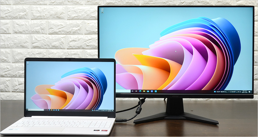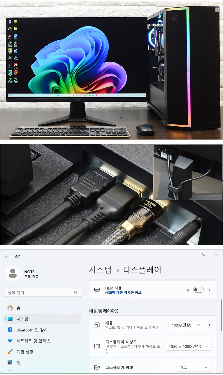 HDMI 단자를 지원해 노트북과 편하게 연결할 수 있다. 게이밍 노트북 중 화면 크기가 작은 모델이나 뛰어난 성능을 지원하지만 주사율이 60Hz 인 크리에이터 노트북을 사용하고 있다면 사진과 같이 HDMI로 연결해 대화면으로 게임을 즐길 수 있다.