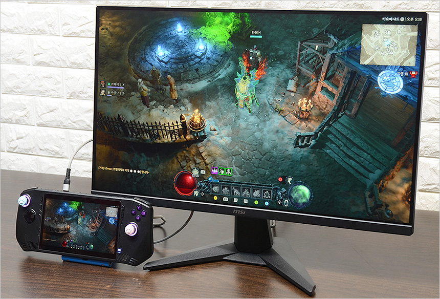 2개의 HDMI 단자가 설치되어 있고 디자인 부분에서 언급한 것과 같이 MSI 콘솔모드를 지원해 PS5 나 XBOX와 같은 게임콘솔과 연결해 활용할 수 있다. 또한 최근 많은 유저들에게 사랑받고 있는 게이밍 UMPC 와 연결해 대화면으로 게임을 즐길 수 있다. 상단의 사진은 MSI 클로를 C타입 to HDMI 케이블로 연결한 모습으로 원활하게 작동하는 것을 확인할 수 있었다.