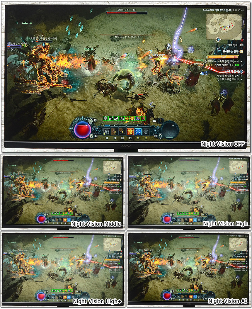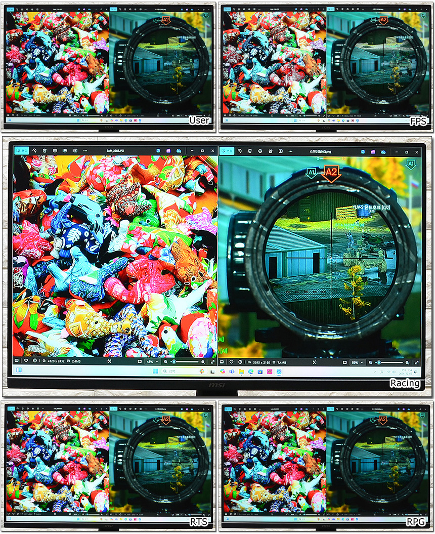 게임 모드를 비교한 모습으로 단순히 밝기 차이만 있는 일부 모니터와 달리 영상이 모드에 따라 확연히 달라지는 것을 확인할 수 있었다. 핫키로 지정되어 있어 게임 실행중 실시간으로 모드를 변경할 수 있었다. (동영상을 확인하기 바란다.)