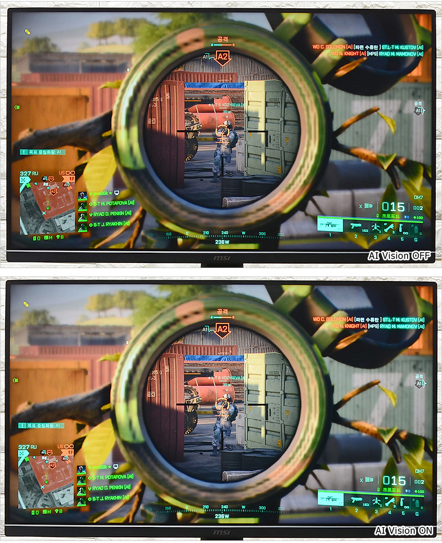 다양한 AI 기술을 선보이고 있는 MSI 의 최신 모델답게 모니터에도 AI 기술을 적용했다. 상단의 사진은 AI Vision을 실행한 모습으로 수동으로 설정할 수 있는 나이트 비전과 달리 게임에 최적화된 영상을 자동으로 설정해 주기 때문에 편하게 사용할 수 있다.