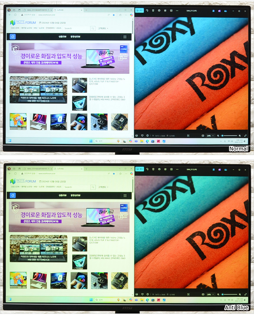원본 JPG 사진을 재생하고 있는 모습으로 TN이나 VA 계열의 패널을 사용한 모니터와 확연히 비교되는 진한 색감이 인상적이었다. 이 제품은 sRGB 115%, DCI-P3 80% 의 색 재현력을 지원하는 제품으로 전문가급 정도는 아니지만 사진편집이나 심플한 디자인 등의 작업용으로는 충분히 사용할 수 있다.
