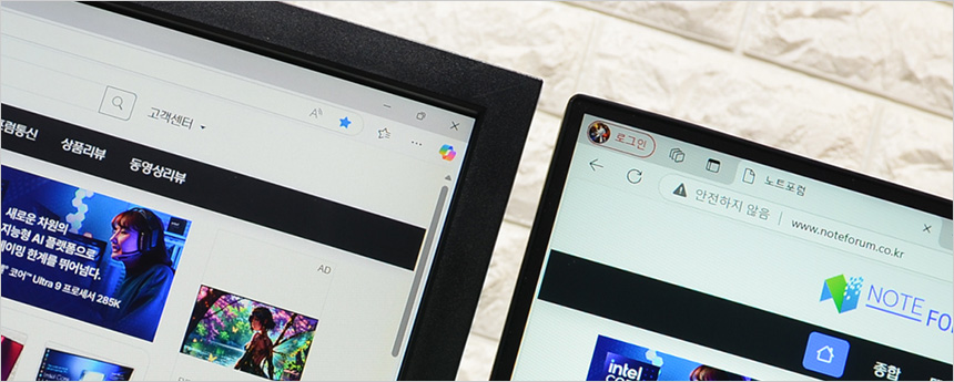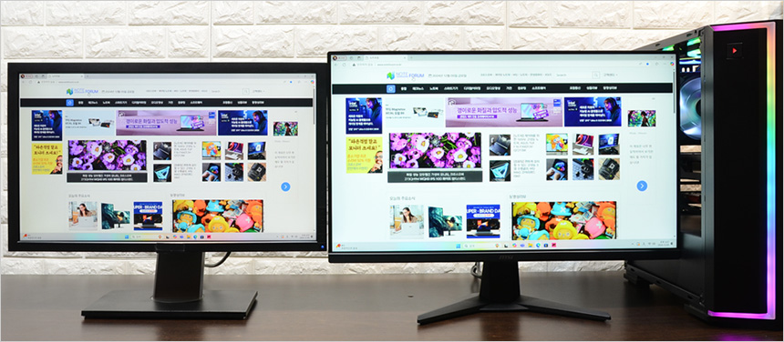 두 대의 모니터를 셋팅한 김에 베젤 두께를 비교한 모습으로 확연한 차이를 보여주었다.