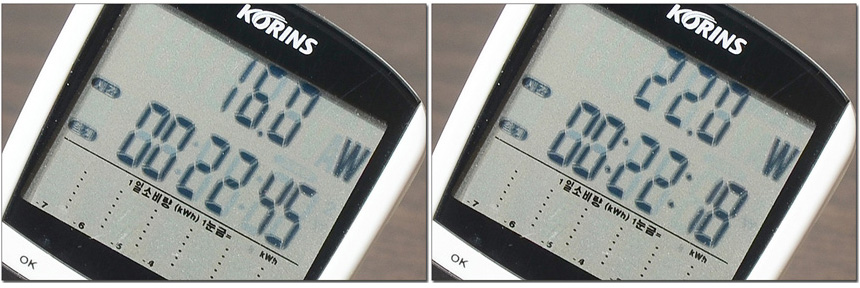 소비전력 테스트를 진행하고 있는 모습으로 100% 밝기에서 22W 소비전력을 보여주었으며 50% 밝기에서는 16W로 소비전력이 줄어드는 것을 확인할 수 있었다. 전기세 걱정없이 사용할 수 있을 것이다. (대기에서는 0.5W를 유지했다.)