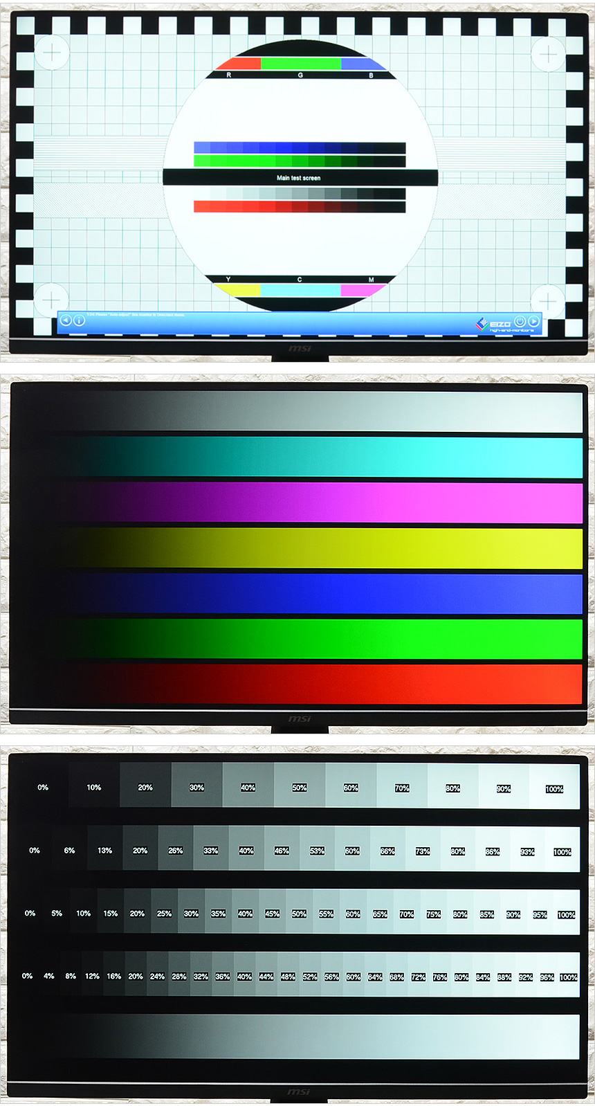 테스트 프로그램을 이용해 화질 테스트를 진행하고 있는 모습으로 IPS 특유의 진한 색감이 인상적이었으며 과도하게 밝기를 올려 색감을 떨어트리는 일부 게이밍 모니터와 달리 색이 아주 자연스러웠다. 상단의 사진은 그레이스케일 차트를 확인하고 있는 모습으로 1,000:1 의 고정명암비를 지원해 확연한 구분감을 제공했다.