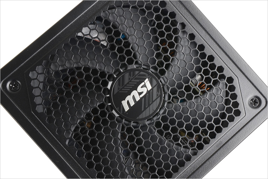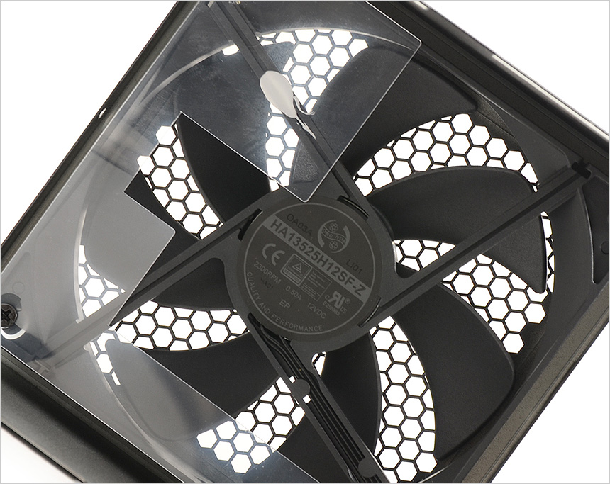 파워 서플라이 상단의 모습으로 상단에서 언급한 것과 같이 135mm 팬이 설치되어 있고 원할한 공기 순환을 위해 벌집 모양으로 타공된 것을 확인할 수 있다. 팬의 크기를 키웠을 뿐만 아니라?Fluid Dynamic 베어링이 장착되어 있고 2300RPM 의 낮은속도로 회전해 소음으로 인한 스트레스 없이 PC를 사용할 수 있다.