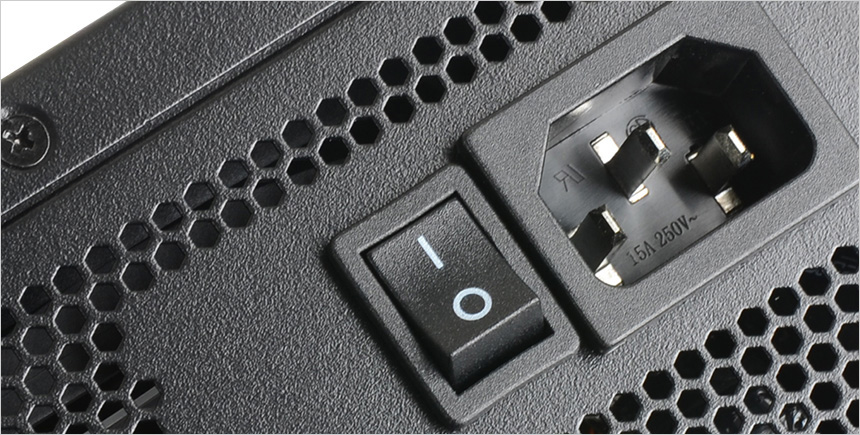 파워 서플라이 후면부의 모습으로 상단과 같이 원할한 공기 순환을 위해 벌집 모양의 통풍구가 설치되어 있고 측면에는 전원 스위치와 전원 단자가 장착된 것을 확인할 수 있다.