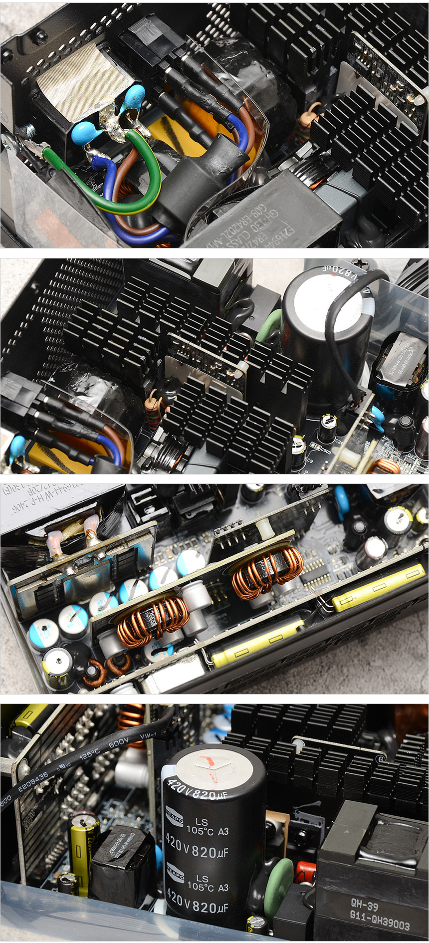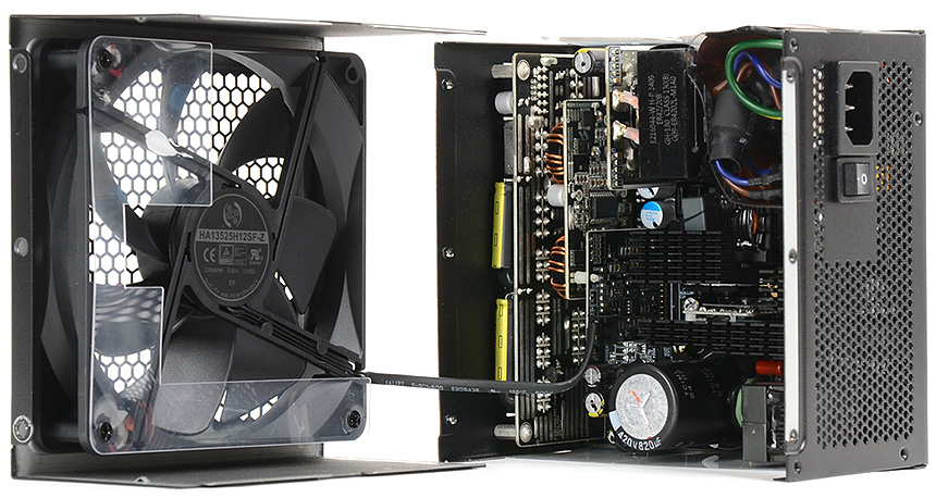 제품 내부의 모습으로 열로 인한 성능 및 안정성 저하를 방지하기 위해 방열판이 부착된 것을 확인할 수 있으며 TEAPO 커패시터와 보조 콘덴서가 장착된 것을 확인할 수 있다. 또한 내부에 여유가 느껴지는 보급형 파워서플라이와 달리 내부 전체가 각종 부품들이 장착된 것이 눈에 띈다.