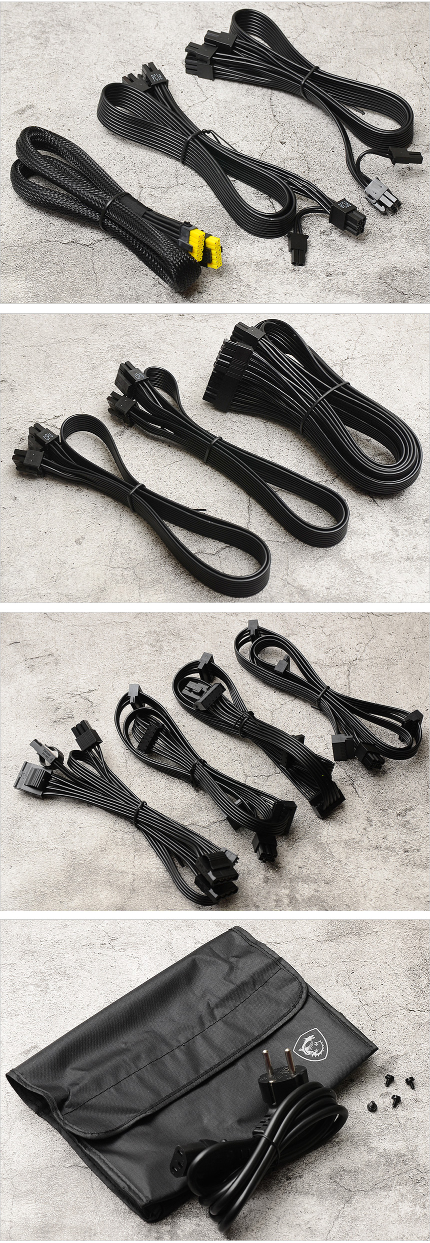 메인보드 전원 공급을 위한 ATX 케이블을 비롯해 2개의 PCIe 케이블?(4개의 커넥터), CPU 전원 공급을 위한 2개의 EPS 케이블이 제공되며 3개의 SATA 케이블과?(12개 SATA 커넥터), 1개의 MOLEX 케이블?(4개의 커넥터)?을 지원한다. 또한 케이블 보관을 위한 파우치와 조립을 위한 볼트, 전원 케이블이 포함되어 있다.