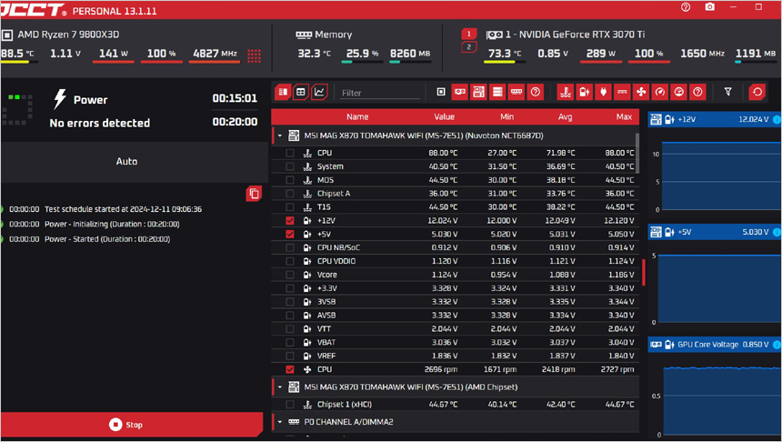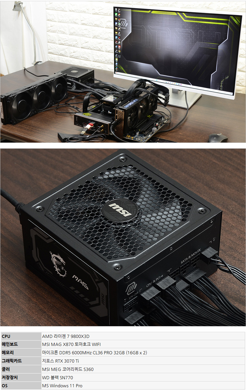 테스트를 위해 PC를 셋팅한 모습으로 게이밍 CPU의 정석으로 평가받고 있는 AMD 라이젠 7 9800X3D를 비롯해 MSI MAG X870 토마호크 WIFI 메인보드와 2개의 DDR5 메모리, RTX 3070 Ti 그래픽카드를 사용했다.