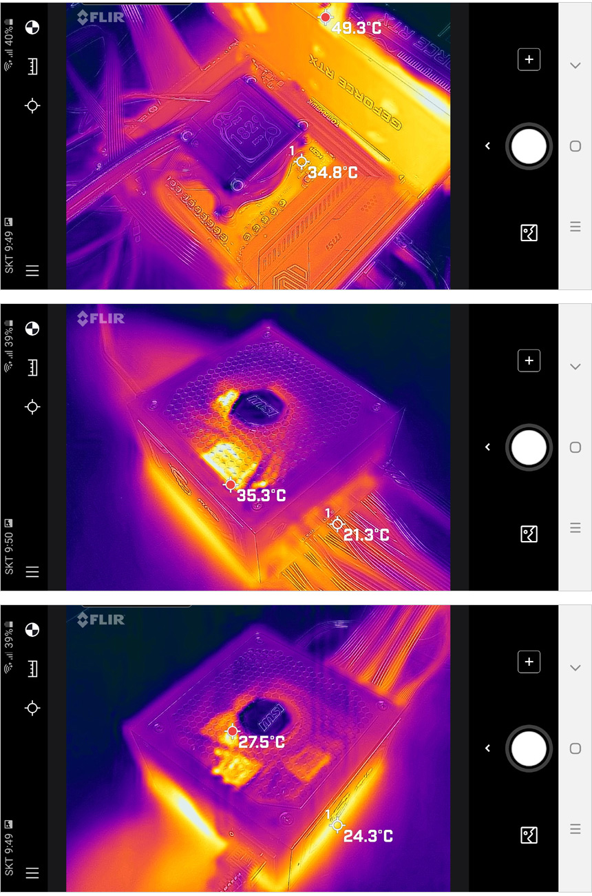벤치 실행시 표면온도를 열화상 카메라로 확인한 모습으로 온도가 높은 그래픽카드?등과 달리 파워 서플라이 온도는 상당히 낮은 것을 확인할 수 있다.?@ 참고로 실내 온도는 15도 였다.