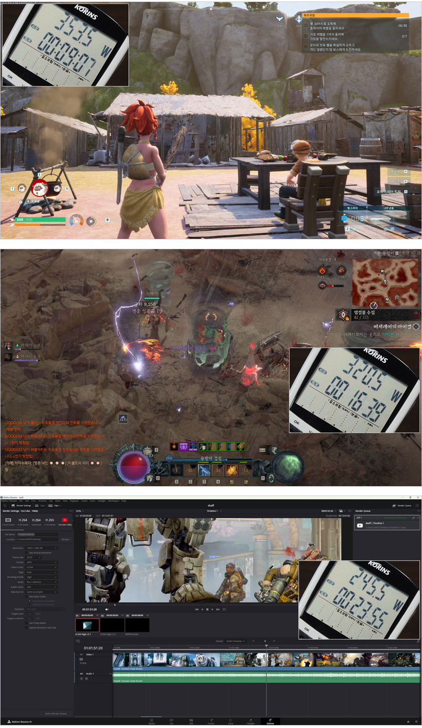 게임과 영상편집시 소비전력을 확인하고 있는 모습으로 벤치마크 보다는 훨씬 낮은 소비전력으로 작동하는 것을 확인할 수 있었다. 1250W 의 높은 출력을 지원하는 제품으로 일반적인 게이밍 PC나 크리에이터 PC는 물론 최상급의 PC에서도 원활하게 사용할 수 있을 것이다.