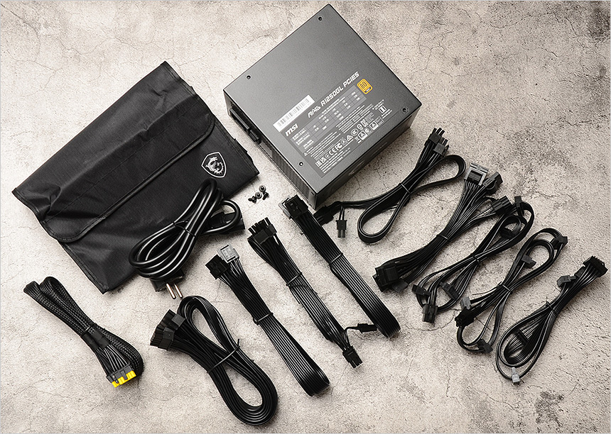 풀KIT 의 모습으로 풀모듈형 파워서플라이 답게 다양한 액세서리가 제공되는 것을 확인할 수 있다. 파워 서플라이를 비롯해 24핀 ATX 케이블과 쉴드 처리된 16핀 12V2x6 직결 케이블, 2개의 CPU 8핀 케이블이 제공되며 2개의 PCI-E 케이블, 3개의 SATA & 주변기기 케이블이 제공되어 PC 부품에 원활하게 전력을 공급할 수 있다. 또한 사용하지 않는 케이블을 손쉽게 관리할 수 있도록 케이블 보관용 파우치가 제공되며 PC케이스에 장착할 수 있도록 볼트를 비롯해 전원 케이블도 포함된 것도 확인할 수 있다.