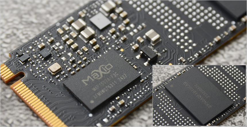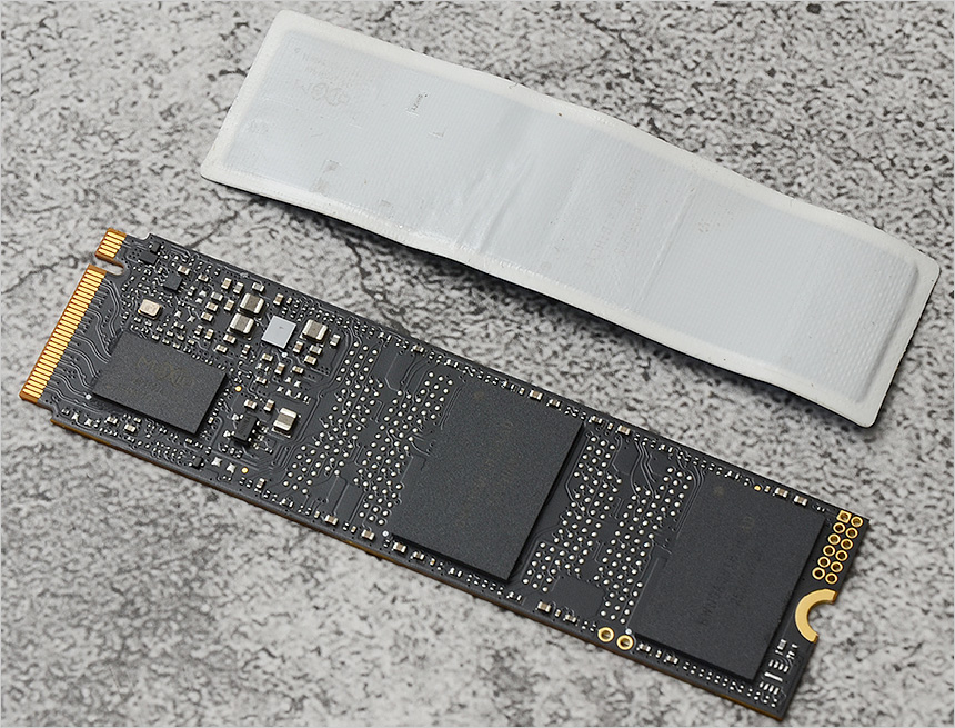 SSD 내부의 모습으로 종이나 얇은 필름 형태의 커버를 사용하는 대부분의 SSD와 달리 컨트롤러와 DRAM의 열을 빠르게 발산해 주는 써멀패드가 부착되어 있다. (히트싱크 수준은 아니지만 발열제어 효과는 탁월하다.) 하단에는 Maxio 컨트롤러와 2개의 DRAM 이 장착되어 있는 것을 확인할 수 있다.