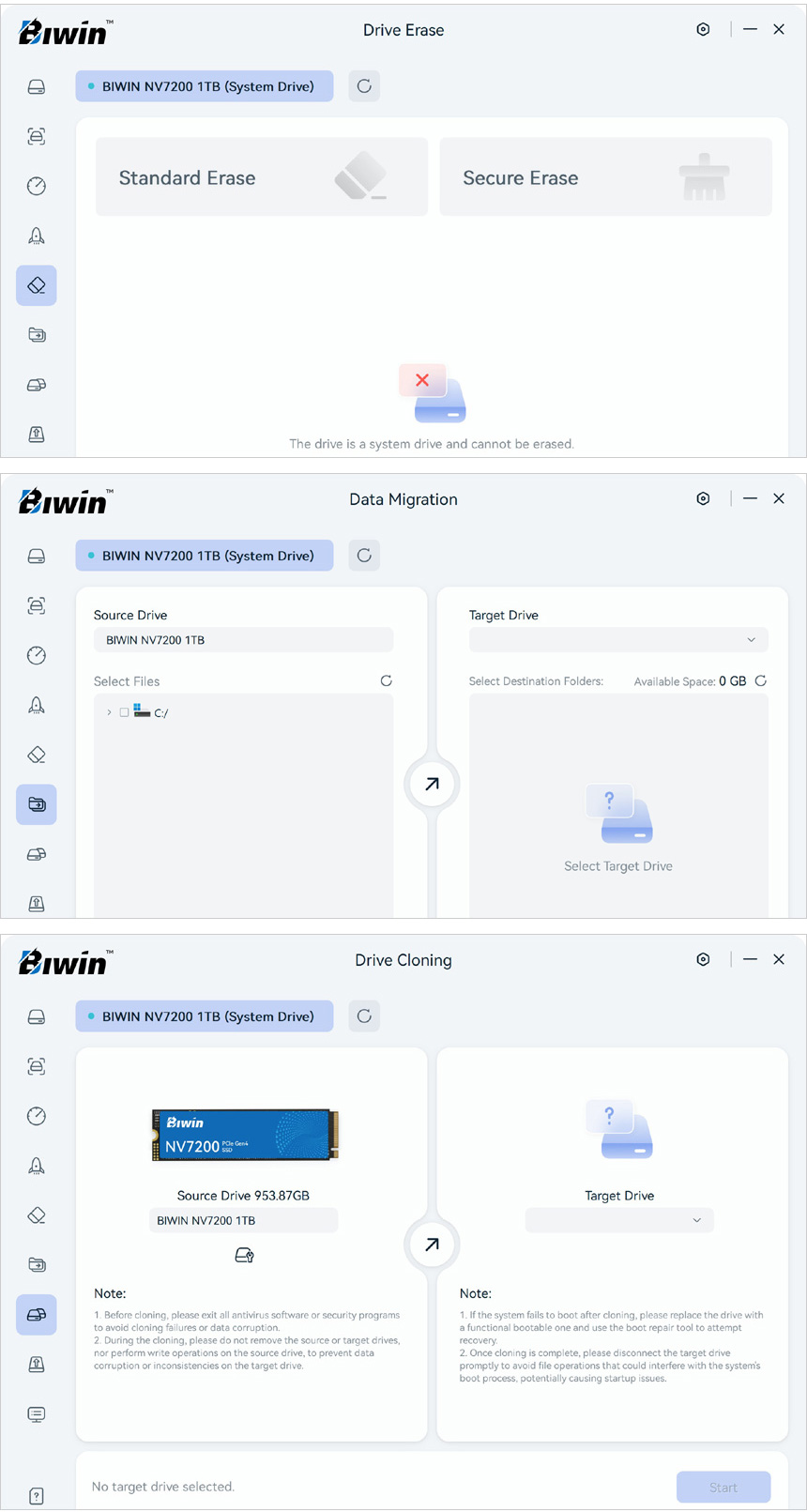보안을 요구하는 데이터를 깔끔하게 삭제할 수 있도록 Erase 기능을 제공하며 손쉬운 데이터 백업을 위해 데이터 마이그레이션 기능도 지원한다. 또한 OS와 드라이버, S/W 설치등의 불편없이 SSD를 교체할 수 있도록 드라이브 클로닝 기능도 제공한다.