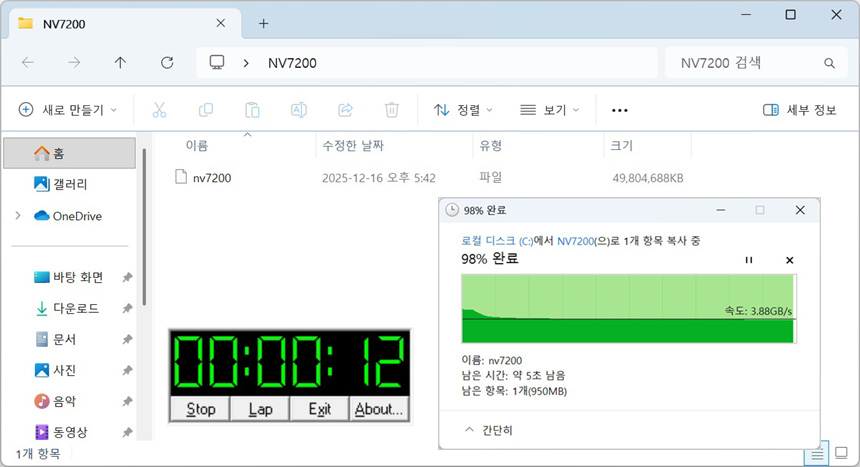 약 50GB의 더미파일을 만든 후 파일 전송속도 테스트를 진행하고 있는 모습으로 (NV7200->NV7200) 4GB/s 에 육박하는 빠른 속도를 보여 주었다. (시간은 12초가 소요되었다.) 75GB 이상에서는 쓰기속도가 느려져 시간이 늘어나지만 50GB 내외에서는 보급형 모델들을 압도하는 빠른 전송속도를 경험할 수 있을 것이다.