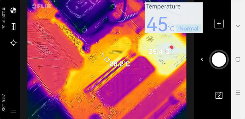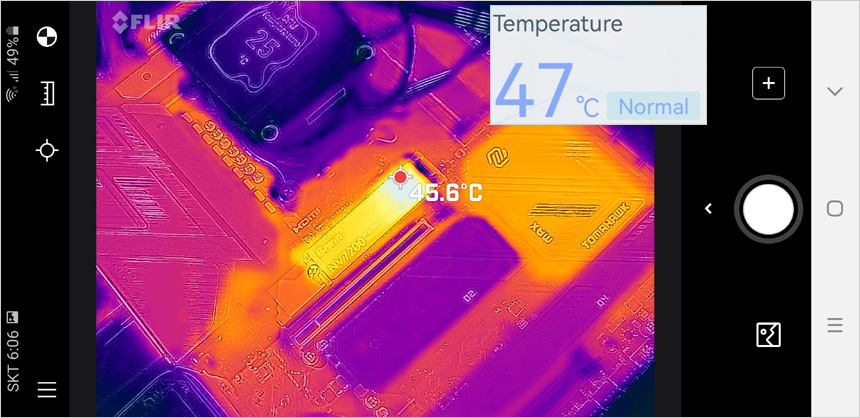 크리스탈 디스크마크의 읽기/쓰기를 2회 진행하고 3번째 실행에서 (실내온도 15도) 열화상 카메라로 SSD 온도를 확인하고 있는 모습으로 메인보드의 히트싱크를 부착한 상태에서 테스트 했을 때 온도가 45도 까지 올라가고 표면 온도는 상당히 낮은 것을 확인할 수 있다.