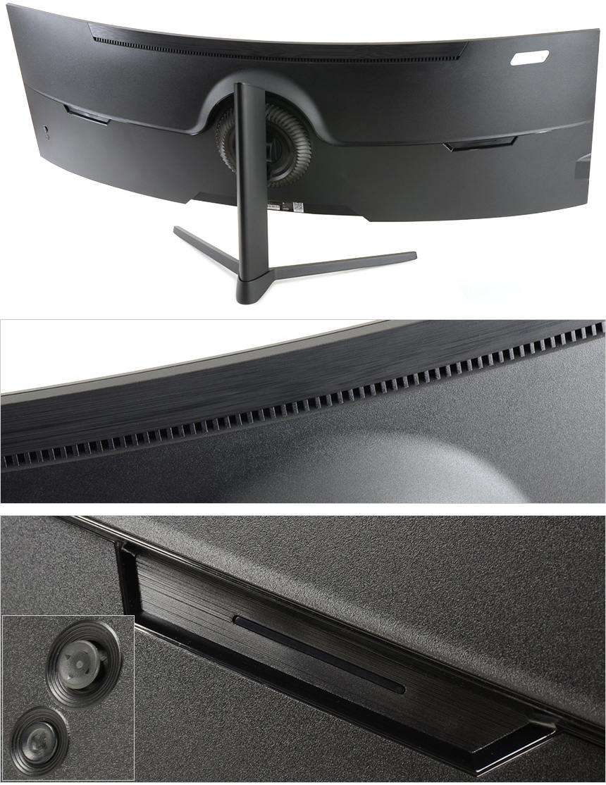 모니터 후면부의 모습으로 손쉽게 OSD를 조정할 수 있도록 조그 버튼이 설치되어 있고 상단에는 안정성을 높이기 위해 통풍구를 제공한다. 또한 중앙과 양 측면에는 RGB LED가 설치되어 있다.