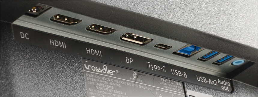 후면 중앙에는 100mm 베사홀이 설치되어 벽에 걸거나 ARM 에 장착해 사용할 수 있으며 (대형 모니터 이기 때문에 무게를 감당할 수 있는 고급형 장비를 사용해야 한다.) 하단에는 DP 와 2개의 HDMI, C타입, 오디오 Out, 2개의 USB, PC연결을 위한 B타입 단자, 오디오 Out, 전원 단자가 설치된 것을 확인할 수 있다.
