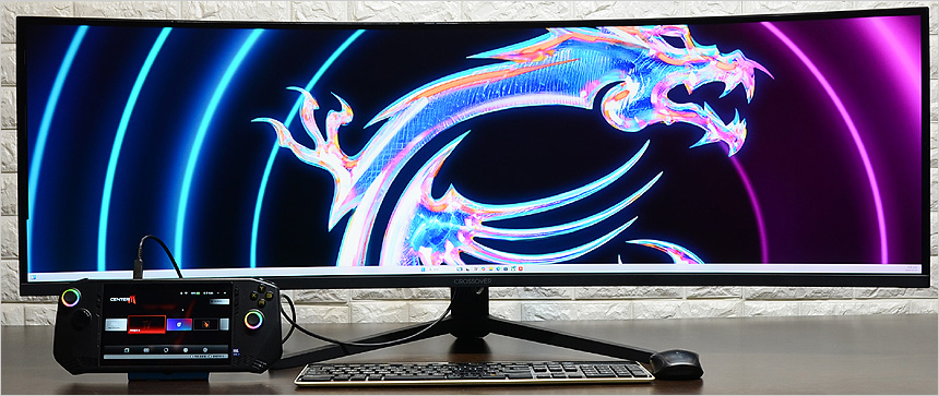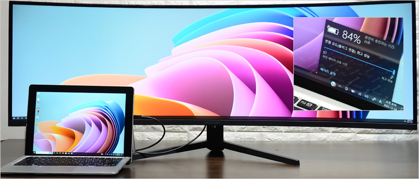 크로스오버 49UV199G 5K BOOST PD65 리얼 게이밍 크로스버스터는 C타입가 설치되어 있고 65W PD충전을 지원해 최신 노트북이나 게이밍 핸드헬드와 좋은 궁합을 보여준다. 케이블 하나만 연결해 주면 대화면을 즐길 수 있으며 전원도 공급되기 때문이다. 상단의 사진은 노트북과 게이밍 핸드헬드를 이용해 테스트를 진행하고 있는 모습으로 완벽하게 작동하는 것을 확인할 수 있었다. (이 제품은 USB 단자 지원으로 키보드와 마우스 연결이 가능하다. 게이밍 핸드헬드를 완벽하게 PC로 활용할 수 있다.)