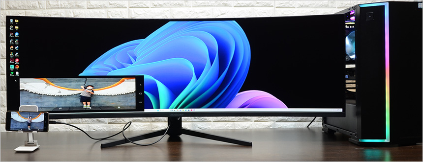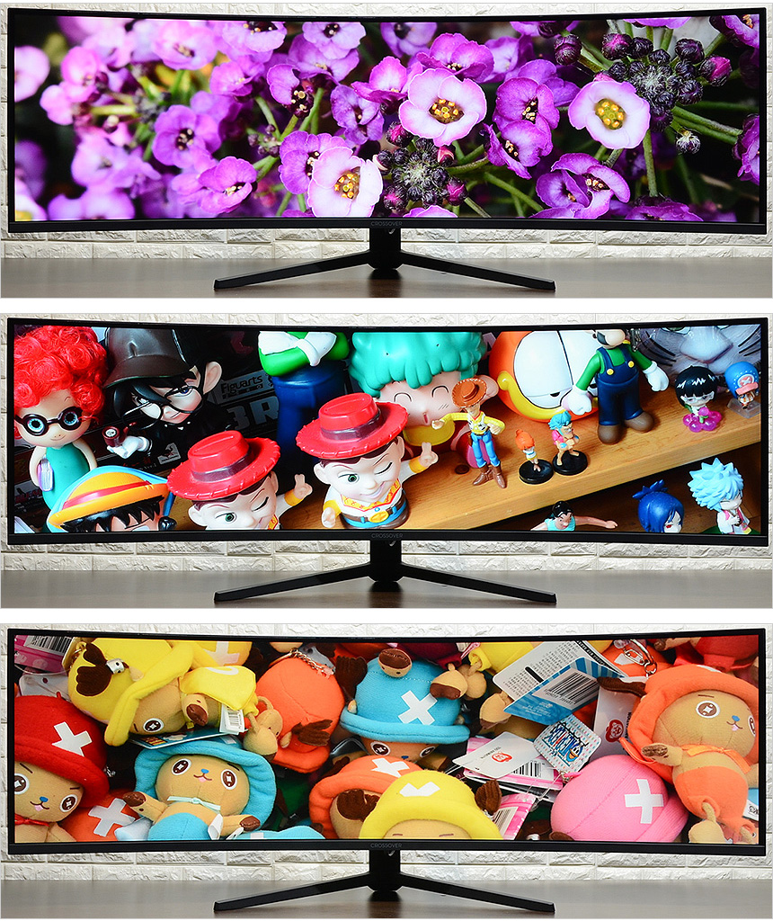 모니터 전면부의 모습으로 32 : 9 슈퍼 울트라 와이드 비율의 49형 디스플레이가 장착되어 있다. 27형 QHD 모니터 2대를 합친 크기로 일반 모니터를 압도하는 몰입감을 경험할 수 있으며 5120 x 1440 해상도 지원으로 일반 모니터와는 확연히 다른 디테일을 보여준다. 10억 7천만 컬러에 450cd/㎡ 의 높은 밝기, DCI-P3 89%, sRGB 125%, AdobeRGB 86% 색 재현력을 지원하는 최고급형 VA 패널을 사용해 시야각으로 인한 불편없이 사용할 수 있을 뿐만 아니라 왜곡없는 생생한 화질을 경험할 수 있다.