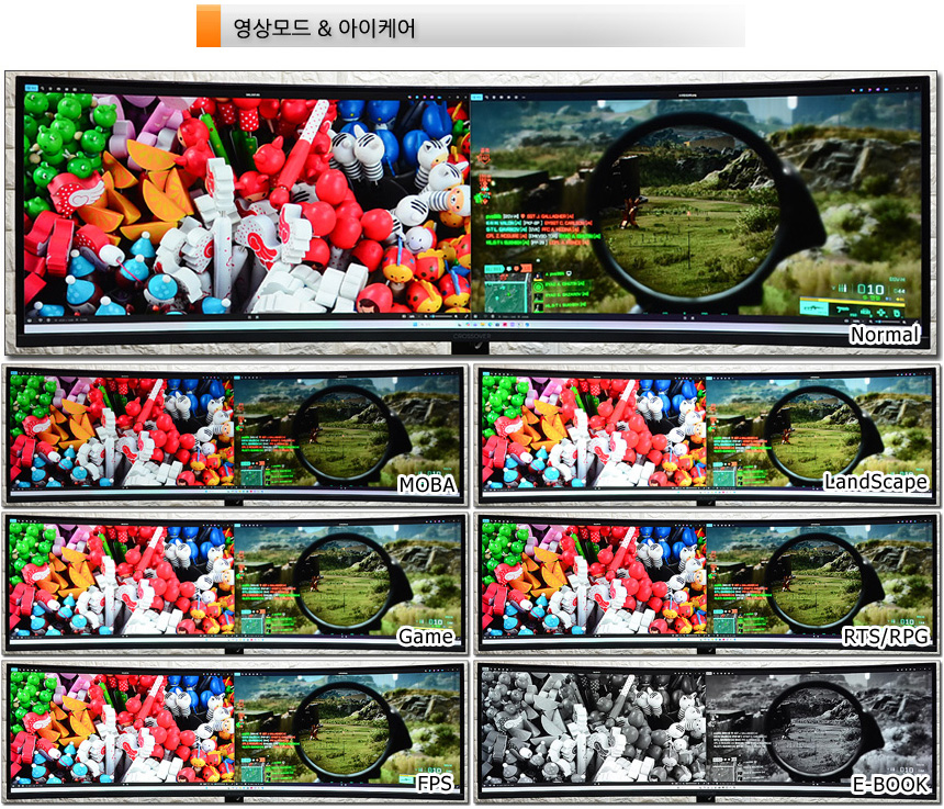 슈퍼 울트라 와이드 비율을 지원해 축구나 레이싱 게임에서 광할한 영상을 한눈에 확인할 수 있으며 배틀그라운드와 같은 FPS 게임에서도 탁 트인 시야로 한눈에 전장 상황을 파악할 수 있다. 뿐만 아니라 게임을 즐기면서 웹서핑이나 기타 작업을 병행할 수 있다.