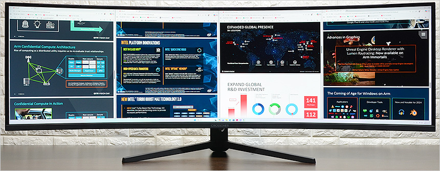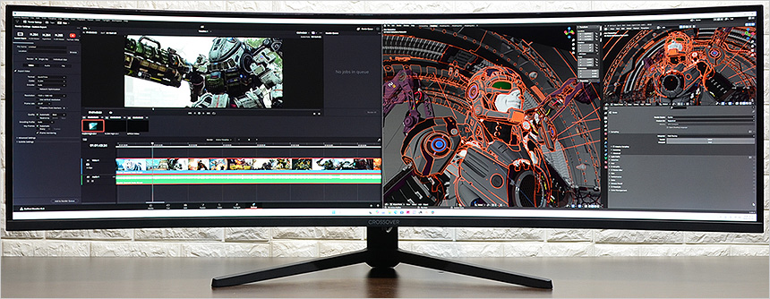 32 : 9 화면 비율에 DQHD 고해상도 지원으로 4개의 창을 여유롭게 띄어두고 사용할 수 있다. 다중창 사용이 필수적인 전문 작업 이외에도 재택근무나 각종 학습용으로도 유용하게 사용할 수 있다. (참고로 PBP 기술도 지원해 2대의 디바이스 화면을 한번에 띄어두고 작업을 할 수 있다.) 참고로 이 제품은 색상 번짐을 최소화 하고 문자 가독성을 높인 크로마서브샘플링 4:4:4 모드를 지원한다.