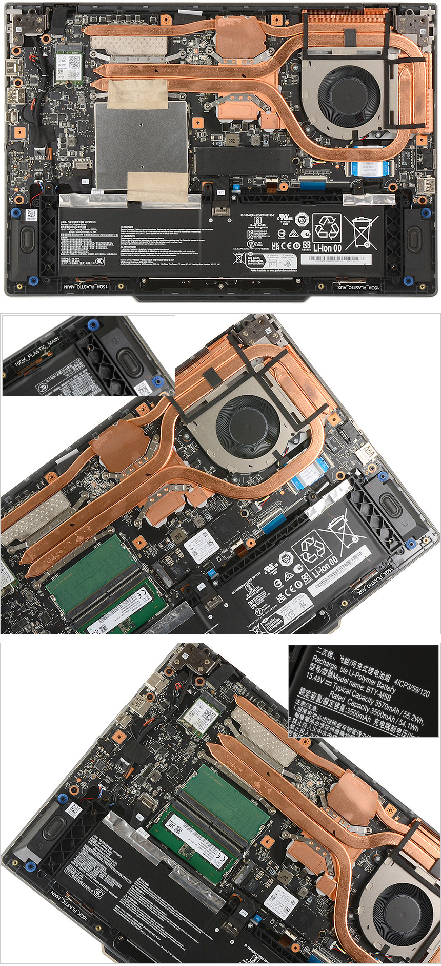 바닥면 내부의 모습으로 낮은 소비전력으로 작동하는 모델답게 싱글팬이 장착되어 있으며 히트파이프가 CPU와 GPU에 연결되어 있어 빠르게 열을 식혀준다. 하단에는 3570mAh 용량의 리튬이온 배터리가 설치되어 있고 스피커와 무선랜 안테나도 설치된 것을 확인할 수 있다.