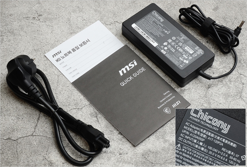 기본 제공되는 액세서리의 모습으로 120W 전원 어댑터와 전원 케이블을 비롯해 퀵 매뉴얼과 보증서가 포함된 것을 확인할 수 있다.