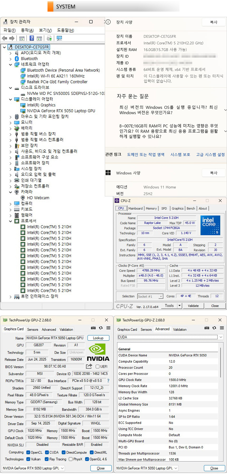 시스템 정보를 확인하고 있는 모습으로 4개의 성능코어와 4개의 효율코어로 구성된 (12 스레드 & 12MB 캐시) 인텔코어 5 프로세서 210H가 장착되어 있고 RTX 5050 랩탑 GPU와 8GB DDR5 메모리, 512GB PCIe 4.0 NVMe SSD 등으로 구성된 것을 확인할 수 있다. @ 테스트용 노트북에는 8GB 메모리가 추가되어 있다. 이점 참조 바란다.