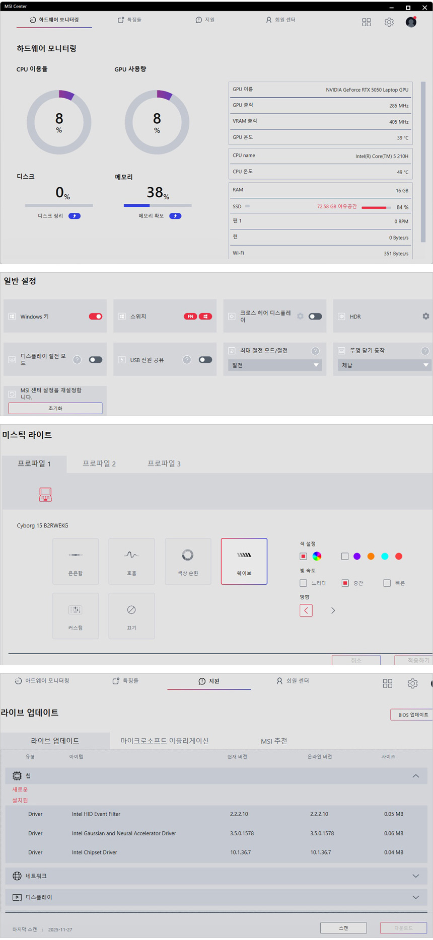 윈도우키와 USB 상시전원 등을 설정할 수 있으며 시스템 업데이트 지원으로 최신의 컨디션을 유지할 수 있다. 또한 시스템 모니터링을 지원해 최상의 컨디션으로 노트북을 사용할 수 있으며 미스틱 라이트 (조명) 설정도 가능한 것을 확인할 수 있다.