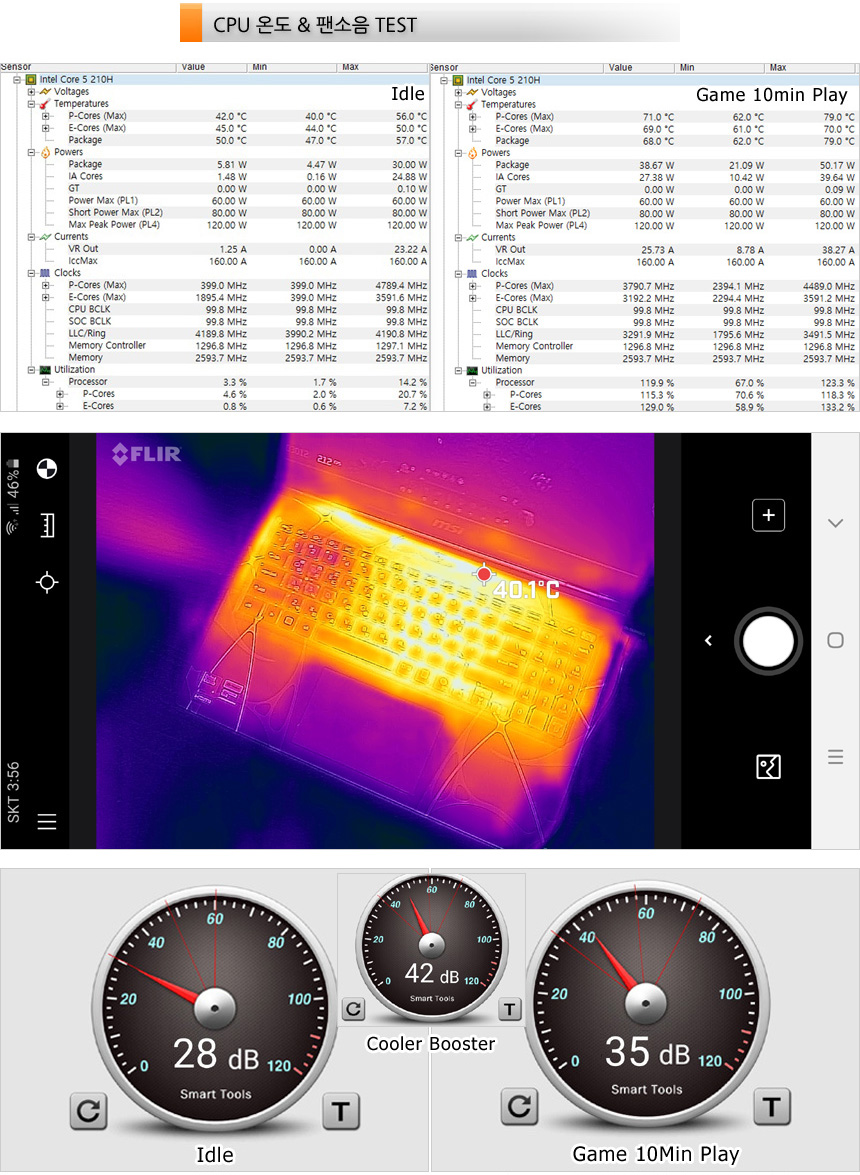 CPU 온도 테스트를 진행하고 있는 모습으로 (실내온도 17도) 아무것도 하지 않는 Idle 상태에서는 40도 초반으로 작동했으며 10분간 게임을 실행했을 때 70도 후반까지 온도가 올라갔다. 또한 열화상 카메라를 이용해 게임 실행시 노트북의 열분포를 확인하고 있는 모습으로 CPU와 GPU가 설치된 중앙부를 중심으로 열이 자연스럽게 퍼져나가며 측면과 후면의 통풍구를 통해 열이 빠져나가는 것을 확인할 수 있다. 팜래스트 온도는 낮아 열로 인한 스트레스 없이 손을 올려두고 노트북을 사용할 수 있다.