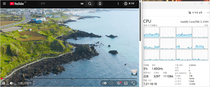 유튜브 고화질 동영상을 이용해 CPU 점유율을 테스트 하고 있는 모습으로 (2160P@60FPS) 5-16% 대의 점유율을 보여주었으며 인터넷을 실행했을 때 30% 초반까지 점유율이 올라가는 것을 확인할 수 있었다.