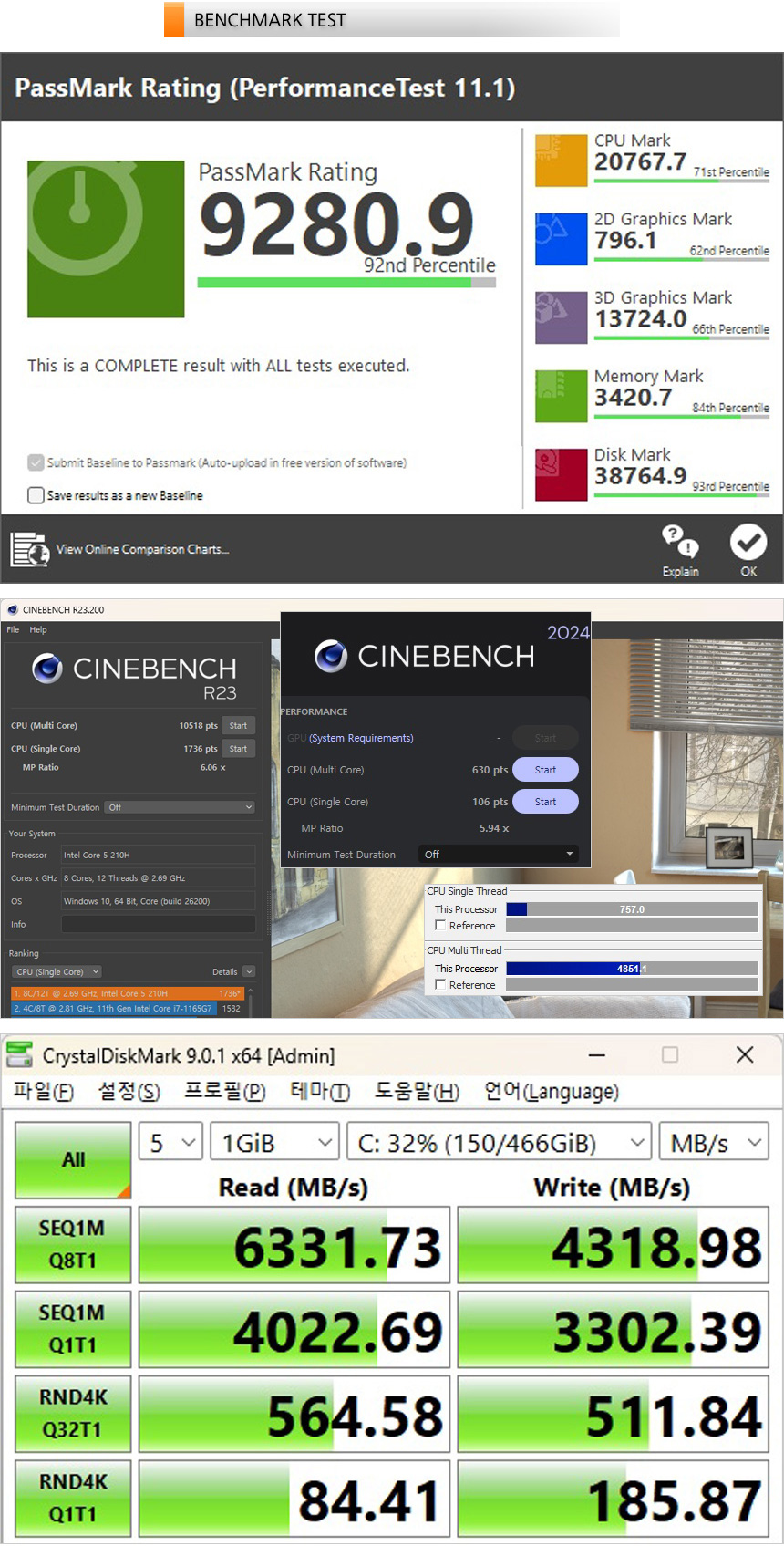 벤치마크 프로그램을 이용해 노트북의 성능을 확인하고 있는 모습으로 게임을 즐기기에 충분한 성능을 보여주었다. 또한 저장장치의 속도를 확인해 보았는데 PCIe 4.0 NVMe M.2 SSD 가 기본 장착되어 속도가 대단히 빠른 것을 확인할 수 있다. 특히 512GB 용량을 지원해 대용량 최신 게임을 편하게 설치할 수 있다.