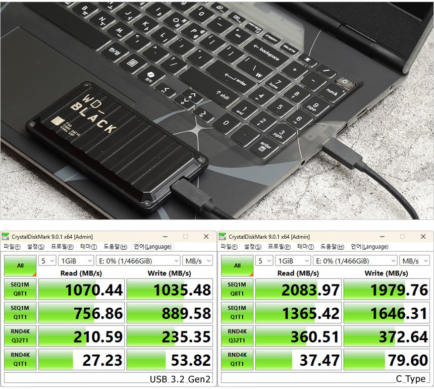 USB 속도를 확인하고 있는 모습으로 C타입 단자가 썬더볼트 4와 같은 2000MB/s 이상의 빠른 속도를 보여주었다. (저장장치는 USB 3.2 Gen2x2 지원 모델이다.) 빠른 데이터 전송이 필요할 경우 만족스럽게 사용할 수 있을 것이다.