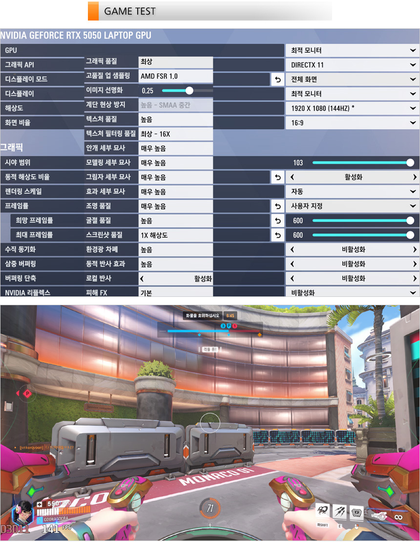 오버워치2를 이용해 게임 테스트를 진행하고 있는 모습으로 최상 옵션을 설정했을 때 115-141 프레임을 보여주어 부드럽게 게임을 즐길 수 있었다. 옵션을 낮춰 140 프레임을 확보하면 144Hz 특유의 부드러움을 만끽할 수 있을 것이다.