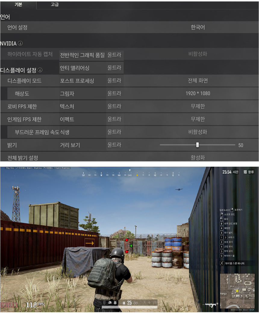 배틀그라운드를 플레이 하고 있는 모습으로 (연습장) 울트라 옵션 설정시 96-120 프레임을 보여주었다. 국민옵션 등을 적용해 프레임이 최대한 확보된 상태에서 게임을 즐기기 바란다.