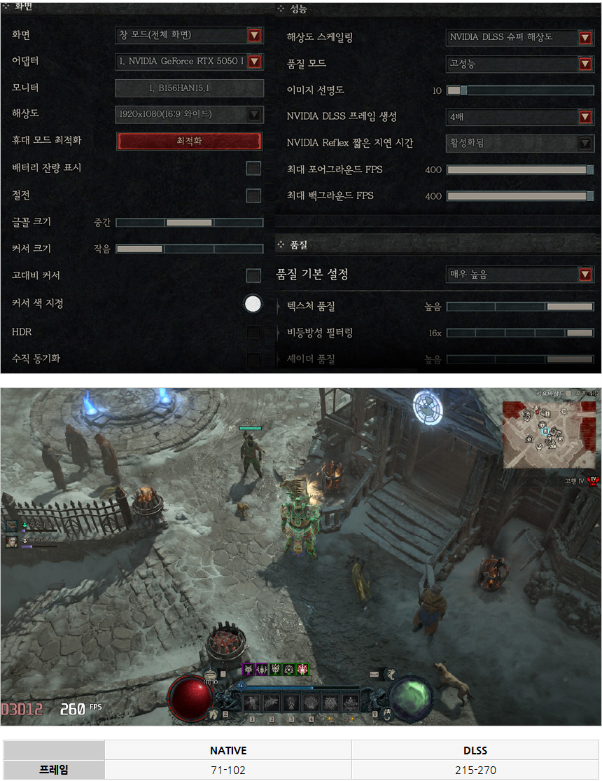 디아블로 4를 매우 높음 옵션으로 플레이 하고 있는 모습으로 DLSS를 사용하지 않아도 충분히 게임을 즐길 수 있다. 단, DLSS를 활성화 하면 프레임이 확연하게 높아지기 때문에 DLSS를 사용하고 프레임을 생성해 게임을 즐기기 바란다.