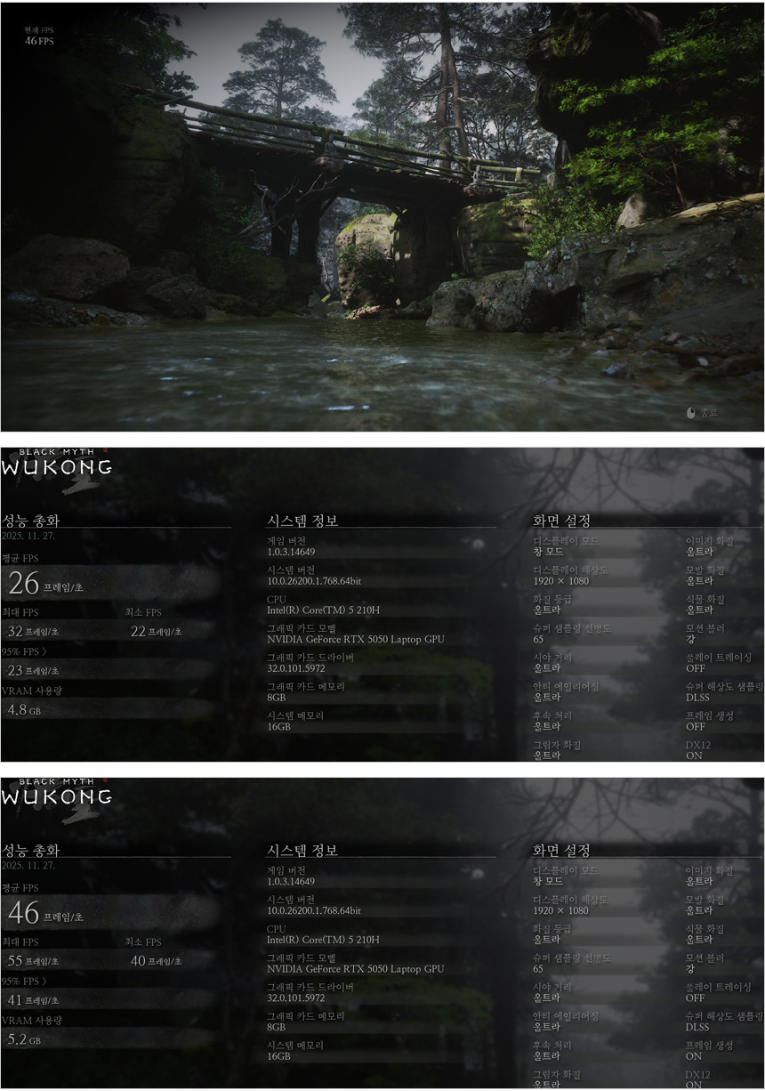 검은신화 오공 벤치마크를 울트라 옵션에서 실행한 모습으로 기본 설정에서는 프레임이 상당히 낮다. DLSS를 이용해 프레임을 생성할 뿐만 아니라 옵션을 낮춰 프레임을 더 확보해야 부드럽게 게임을 즐길 수 있다.