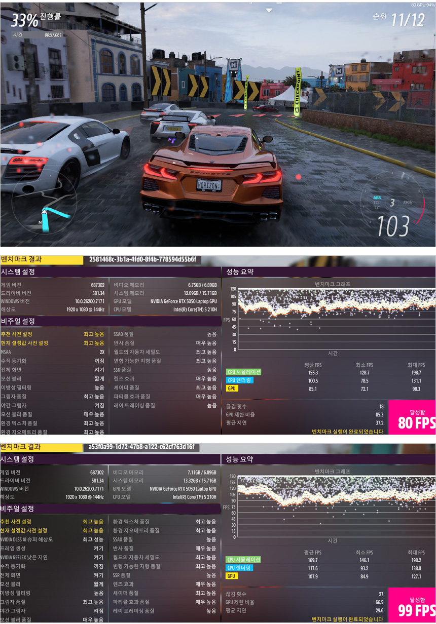 포르자 호라이즌 5를 최고높음 옵션으로 설정해 실행한 모습으로 부드럽게 게임을 즐길 수 있는 높은 스코어를 보여주었다. DLSS를 적용하면 20 정도 프레임이 높아져 더 부드럽게 게임을 즐길 수 있다.