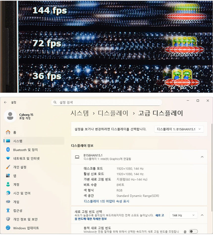 60Hz 주사율을 지원하는 일반 노트북과 달리 게이밍 노트북 답게 144Hz 주사율 지원으로 끊김 없는 부드러운 움직임으로 생생한 화면을 체감할 수 있다. 상단의 사진은 144Hz 주사율을 쉽게 인지할 수 있도록 하위 프레임과 같이 재생되는 영상 (960 Pixel Per Sec) 을 셔터스피드 1/20 로 촬영한 모습으로 프레임이 높아질수록 시간당 많은 화면이 뿌려져 캐릭터의 수가 많은 것을 확인할 수 있다. 직접 눈으로 영상을 볼 경우 72Hz나 36Hz 의 경우 화면이 늘어지고 깨지는 느낌을 주는데 반해 144Hz 의 경우 자연스럽게 UFO 가 이동한다.