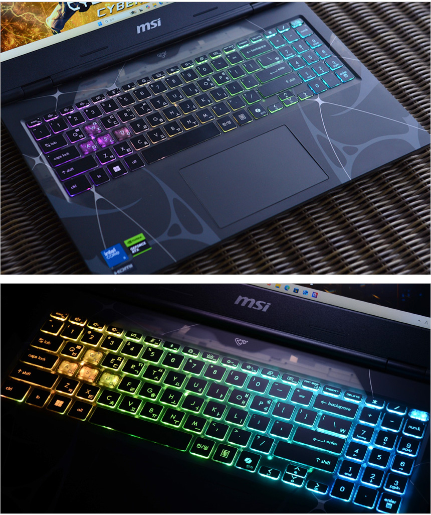 키보드의 모습으로 15.6형 대화면 노트북 답게 텐키가 포함된 풀사이즈 키보드가 장착되어 있다. 특히 키캡 테두리 부분까지 조명이 적용되어 확연한 구분감을 제공하며 단색의 백라이트를 지원하던 전작과 달리 4존 RGB 백라이트를 지원해 아름다운 조명 효과를 즐길 수 있었다. 또한 게이밍 노트북 답게 WASD 키에 포인트를 주어 구분감을 높인것도 마음에 든다.