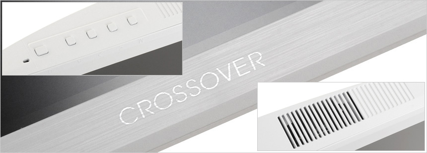 모니터 전면 하단부의 모습으로 중앙에 크로스오버 레터링이 세겨져 있으며 측면 하단에는 모니터 환경설정을 위한 OSD 버튼과 상태표시 LED, 2개의 3W 스피커가 장착된 것을 확인할 수 있다.