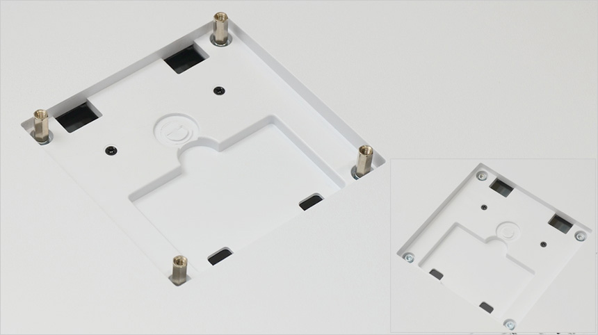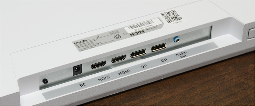 후면 중앙에는 100mm x 100mm 베사홀이 제공되어 벽에 걸어 사용하거나 ARM 등에 장착할 수 있다. (베사 연장볼트 지원으로 편의성을 높였다.) 또한 다용도로 활용할 수 있는 대화면 모니터 답게 PC 연결을 위한 2개의 DP단자를 비롯해 노트북, IPTV, 게임콘솔 등 다양한 디바이스 연결을 위한 2개의 HDMI 단자를 제공하며 오디오 OUT 단자, 전원 단자 등이 설치되어 있다. (리모콘 사용을 위한 IR 센서도 설치되어 있다.)