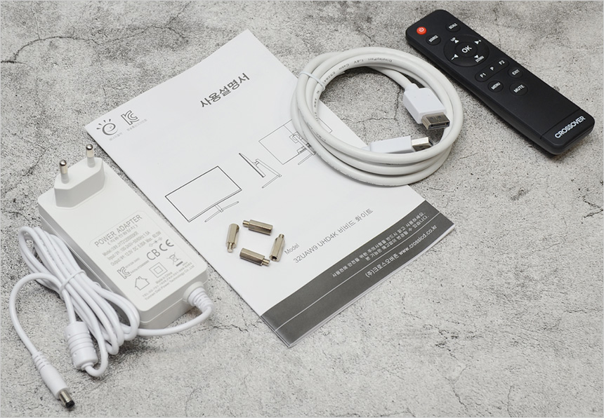 액세서리의 모습으로 전원 어댑터를 비롯해 DP 케이블과 베사연장볼트, 사용 설명서, 리모콘이 포함된 것을 확인할 수 있다.